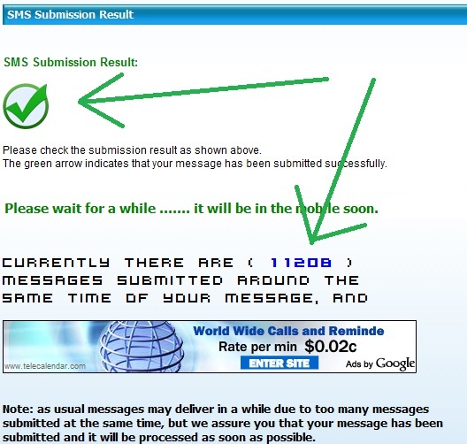 despues te mandara a una pagina en la que te informara cuantos mensajes de texto estan pendientes para enviar, entre esos esta el tuyo, pero no te preocupes no tardara mucho en llegar, yo envie este mensaje de prueba a un numero comcel colombia y llego a los 3 minutos con 26 segundos despues y eso que habian 11208 SMS pendientes....
